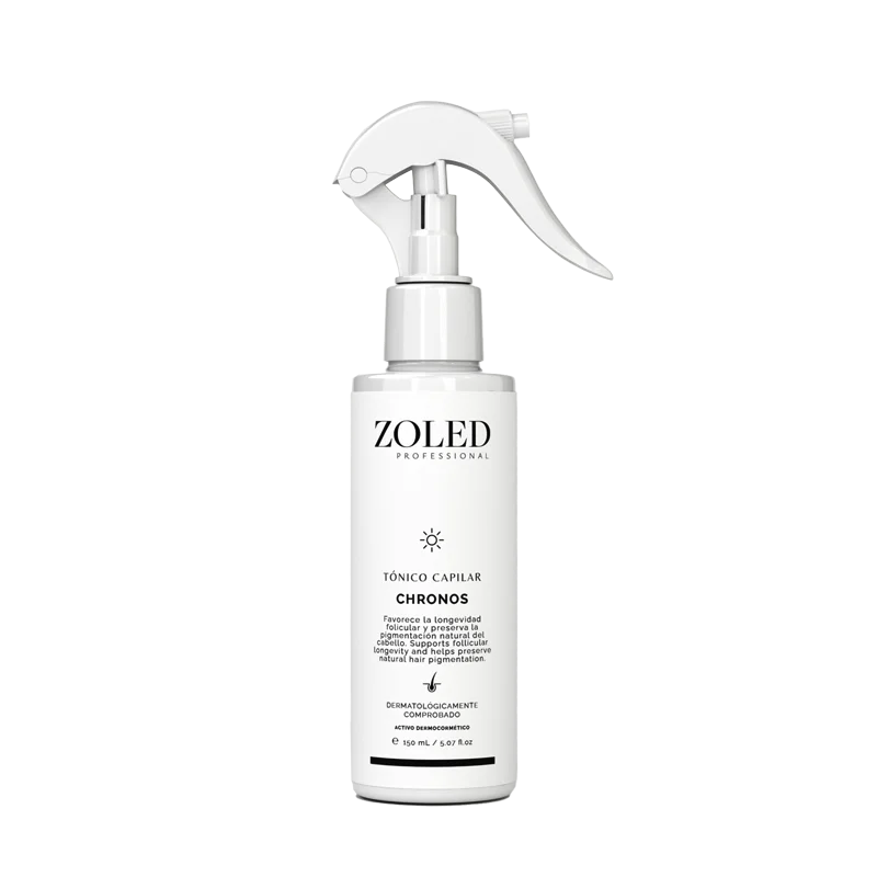Chronos es un tónico capilar de alta especialización formulado para favorecer la longevidad folicular y preservar la pigmentación natural del cabello, retrasando los signos visibles del envejecimiento capilar, optimizando la vitalidad de los folículos y promoviendo un crecimiento más fuerte, estable y biológicamente activo. Desarrollado con tecnología biomimética, Chronos imita los procesos naturales de protección y regeneración del cuero cabelludo, manteniendo un entorno equilibrado que prolonga la vida útil del folículo y mejora su desempeño. Esta tecnología actúa reforzando la estructura biológica del cabello, favoreciendo una mejor respuesta ante el estrés oxidativo, uno de los principales desencadenantes de la pérdida de pigmento.